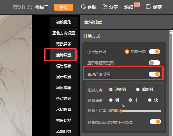 全景浏览时自动旋转,可在编辑-全局设置里进行设置,包括旋转方向,旋转速度,已经开场方式,具体如下: