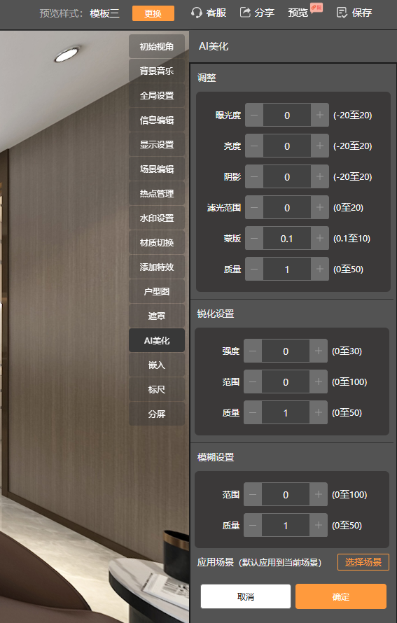 全景AI美化,即调整全景图片的基本参数值,如:曝光度,亮度,阴影,滤光范围,锐化值,模糊值等,快速提升图片的表现效果。