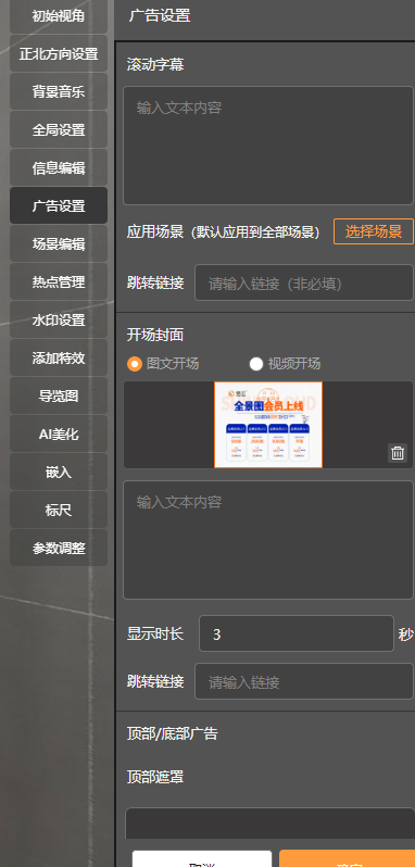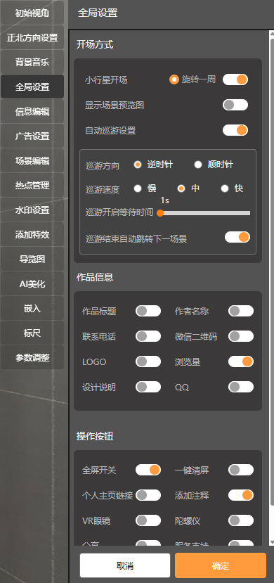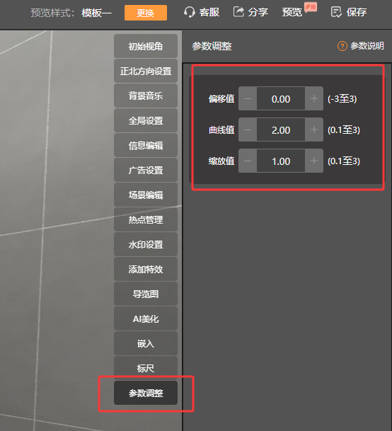 1. 编辑页-立体全景-参数调整:如下编辑页面,对立体全景的偏移值,曲线值,缩放值可以调节以呈现最佳的呈现效果。