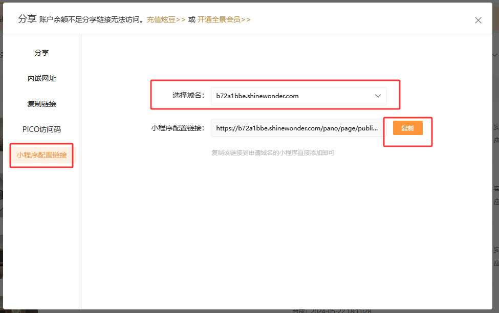 1. 全景分享提供小程序配置链接:申请小程序域名后可直接复制每个作品的配置链接,如下: