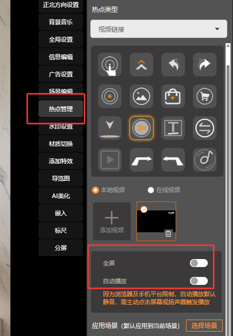 3. 热点视频全屏及自动播放设置功能:全屏,自动播放功能自主开启,如下: